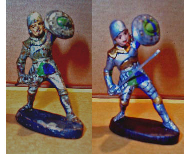 | 54mm Composition knight manufactured by Elastolin,Germany.Approx 1940`s.Produced by moulding wood,flour,fine white clay & glue on a wire armature in a brass mould.Tinplate sword. |